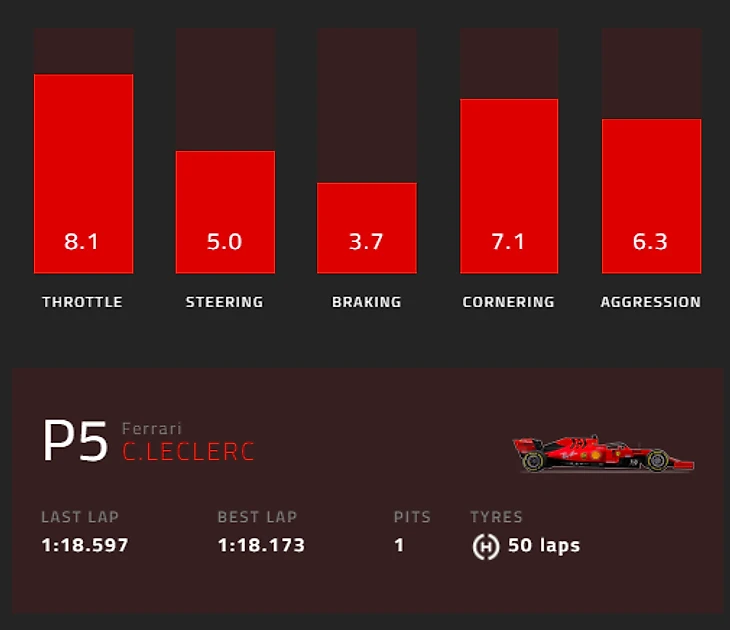 Второе место занял Шарль Леклер из «Феррари» – с оценкой в 6. Она сложилась из 8,1 за работу с педалью газа, 5 за работу рулем, 3,7 за работу на торможениях, 7,1 за прохождение поворотов и 6,3 за «агрессивность». Монегаск стартовал 7-м и финишировал 5-м.