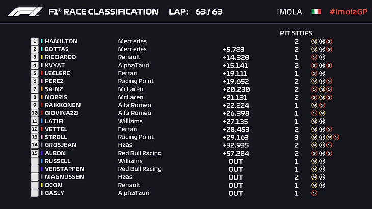 На рестарте Боттас не смог оказать никакого сопротивления Хэмилтону, Квяту удалось почти разом пройти Переса, Албона и Леклера, но Риккардо оказался россиянину не по зубам. Шарль отбился от Переса, позади которого финишировали два Макларена и два Альфа Ромео. Где же Албон? Алекс потерял все шансы на очки после разворота.