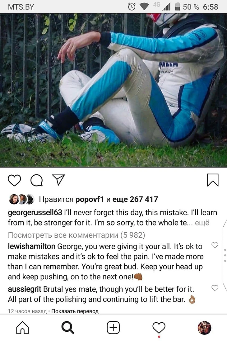 Затем Расселл запостил в инстаграм кадр с собой у барьеров и подписью: «Никогда не забуду этот день, эту ошибку. Научусь на ней и стану сильнее. Так жалко, прощу прощения у всей команды. Никаких оправданий».
