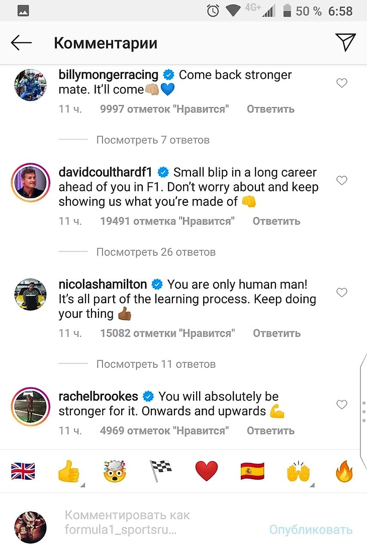 И к нему в комментарии пришли действующие и бывшие коллеги – от Льюиса Хэмилтона и Марка Уэббера до Ромена Грожана, тоже пережившего похожий момент в прошлом.