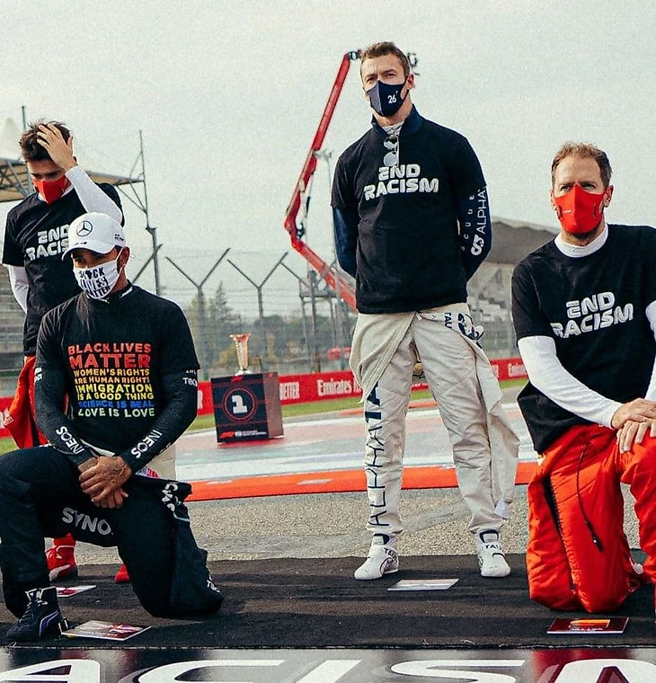 Хэмильтон решил, что решение ФИА его не касается. Он же особенный!!1!! (Там кароч дяди порешали, что перед стартом так и быть можно быть в майках энд расизм, а Хэму в БЛМ, потом никаких маек до подиума и только потом как хош). И он решил так: «одного слогана мало. Двух тоже. Да хрен с ним, три тоже мало. За что там сейчас все пытаются бороться, но кроме постов в твитторе ничего не делают? Вот это и нафигачьте. И все сделайте разными цветами, как будто гном блеванул буквами!» Разговор подлинный.