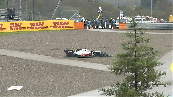 А Латифи застрял в гравии – его развернуло. Вместе с ними вылетают Магнуссен, Расселл и Грожан.