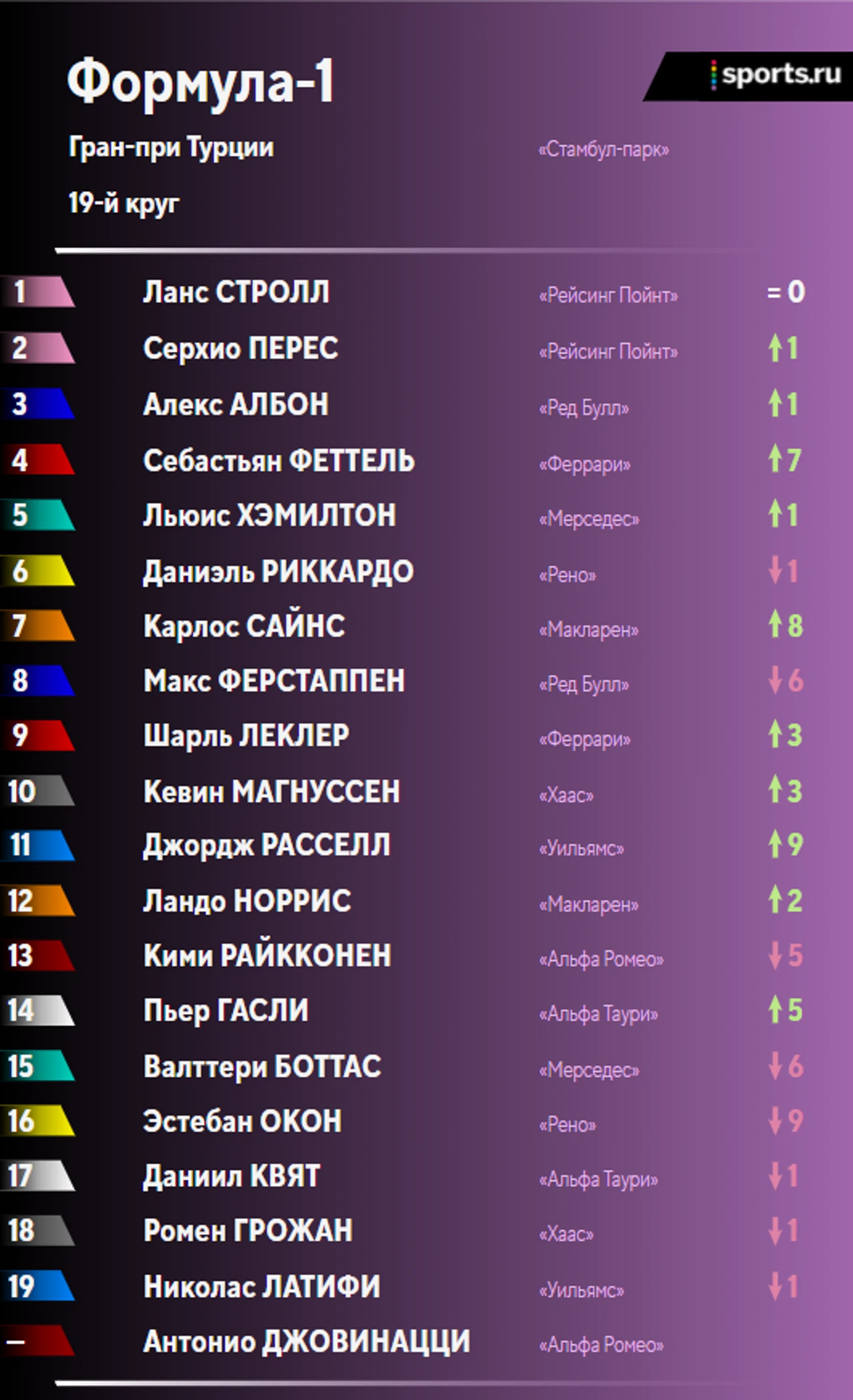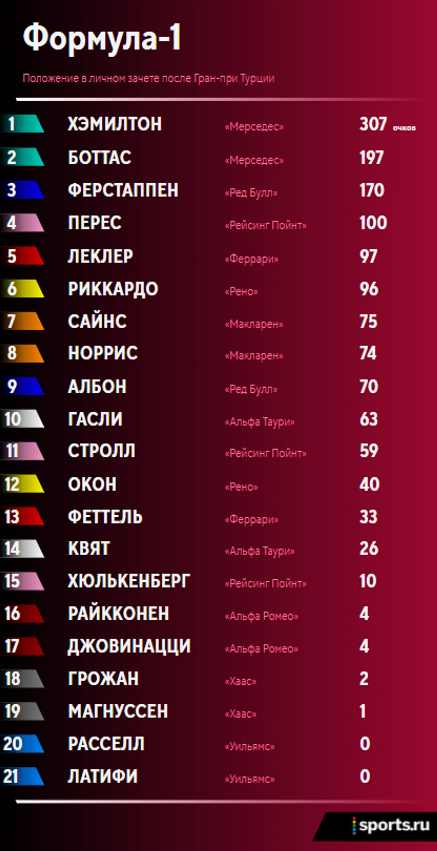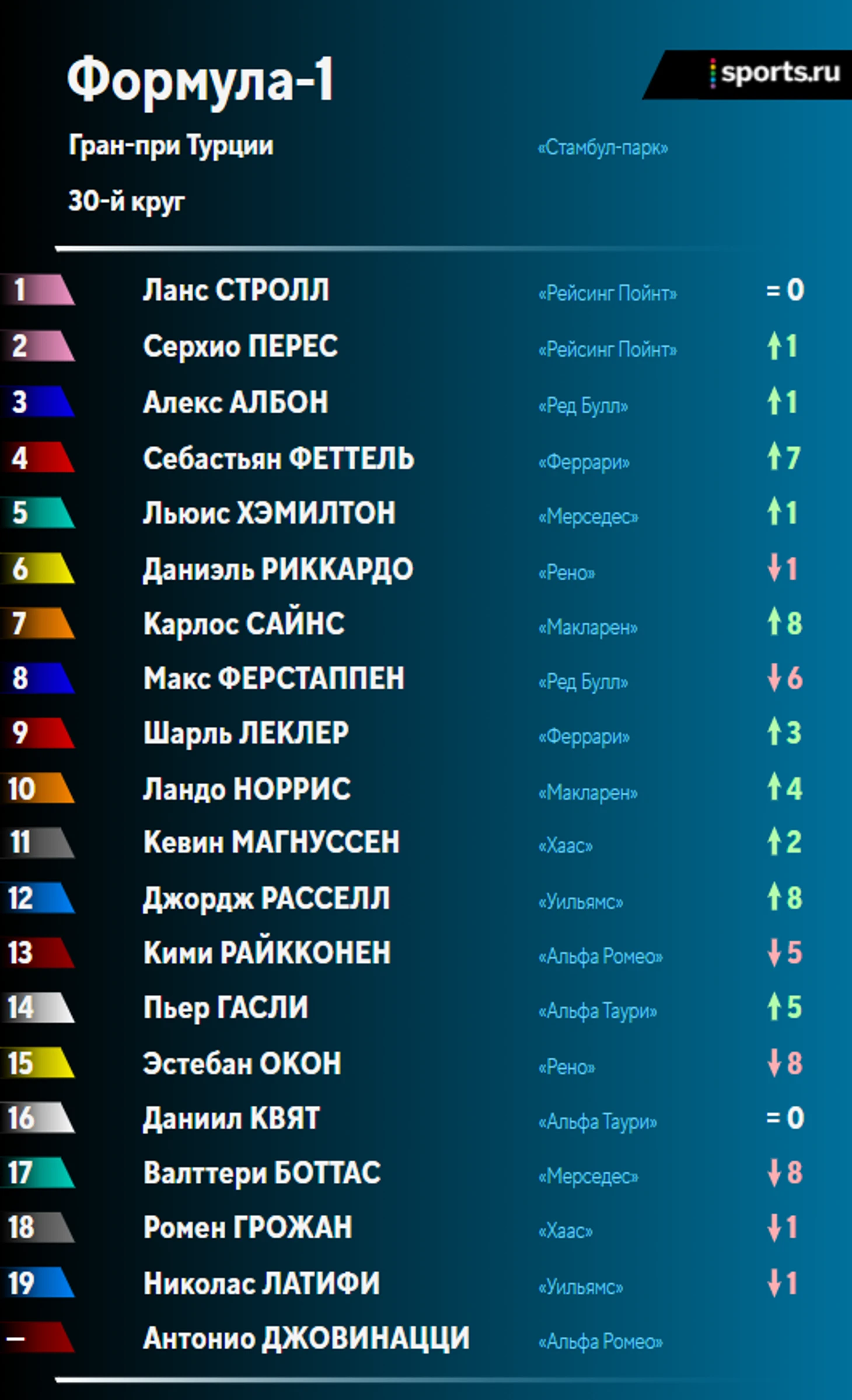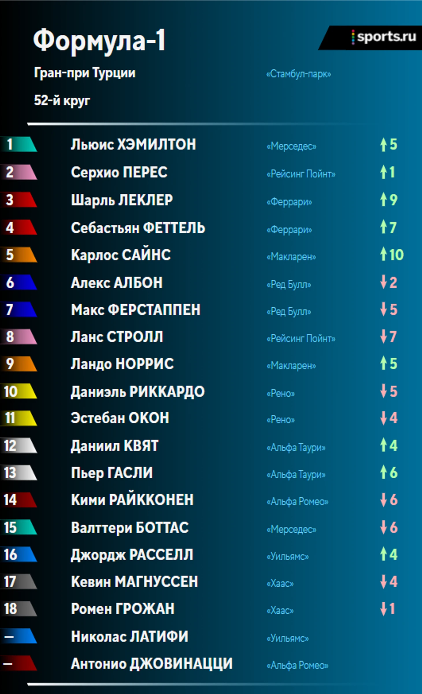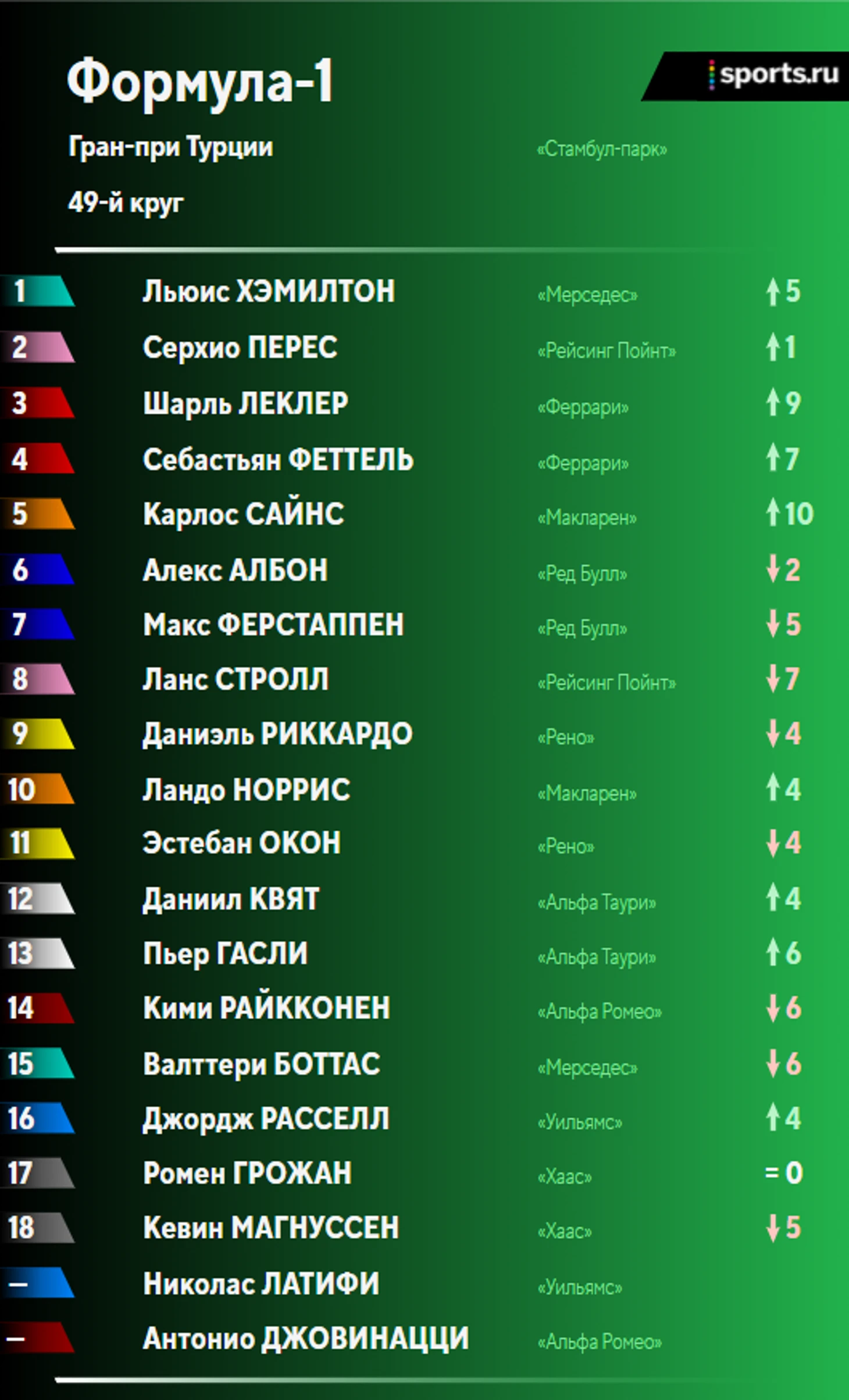 12:56 Во всем этом хаосе мы чуть не забыли про Хэмилтона – а ведь сегодня британец может стать семикратным чемпионом. Для этого ему нужно проиграть Боттасу не более 8 очков. С учетом стартовых позиции это кажется не очень сложной задачей. Хотя, возвращаясь к условиям...