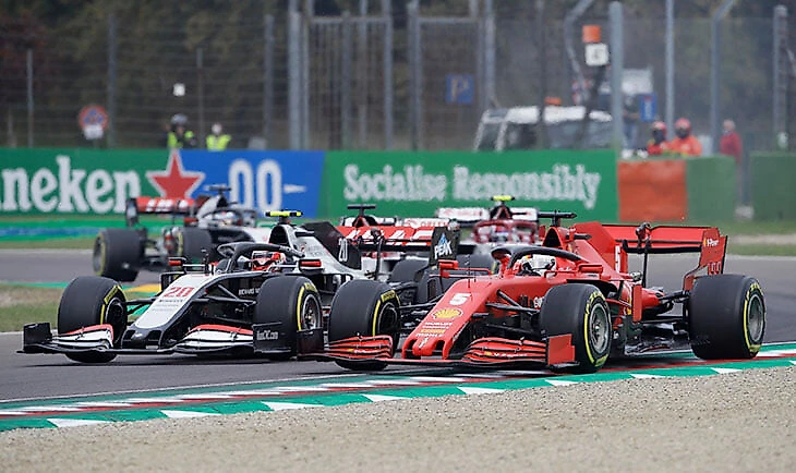 Феттель догнал Стролла, тот бросился в контратаку и заблокировал «Феррари». Одновременно Феттеля догнал Леклер, который успел обогнать Албона. Две красные машины едут рядом.