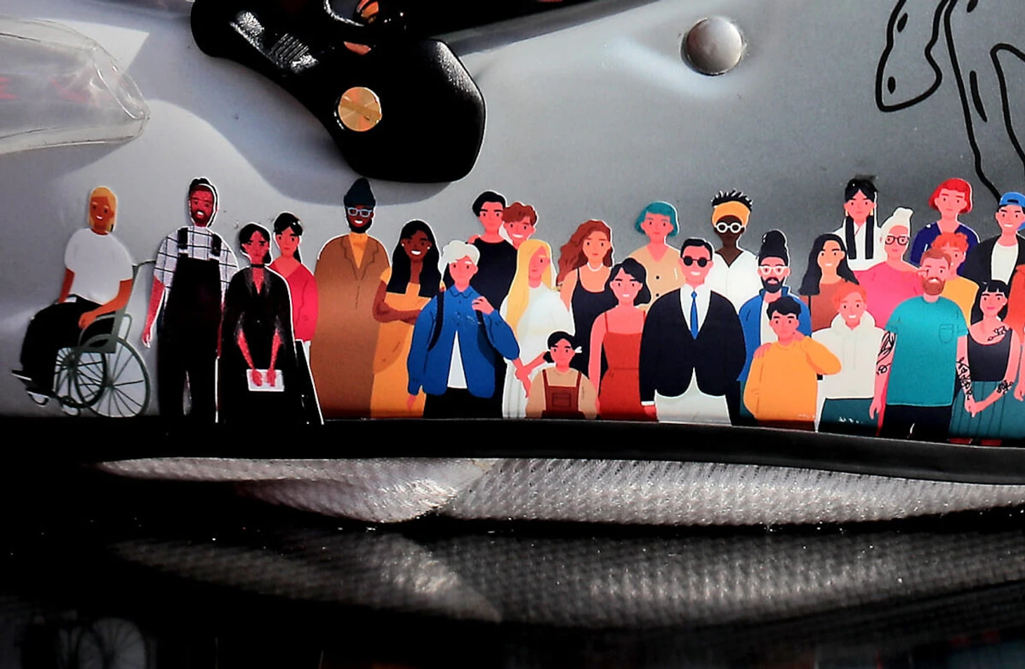 Дизайн дополнили фигурки людей – на их плечи ложится концептуальная составляющая творения. В соответствии с девизом, размещенным в верхней части («Вместе как один»), гонками наслаждаются все: мужчины с бородами и без, женщины всех цветов кожи, гетеро- и гомосексуальные пары, а также люди с ограниченными возможностями, о которых порой забывают в спорах о разнообразных типах дискриминации (респект, Себ!).