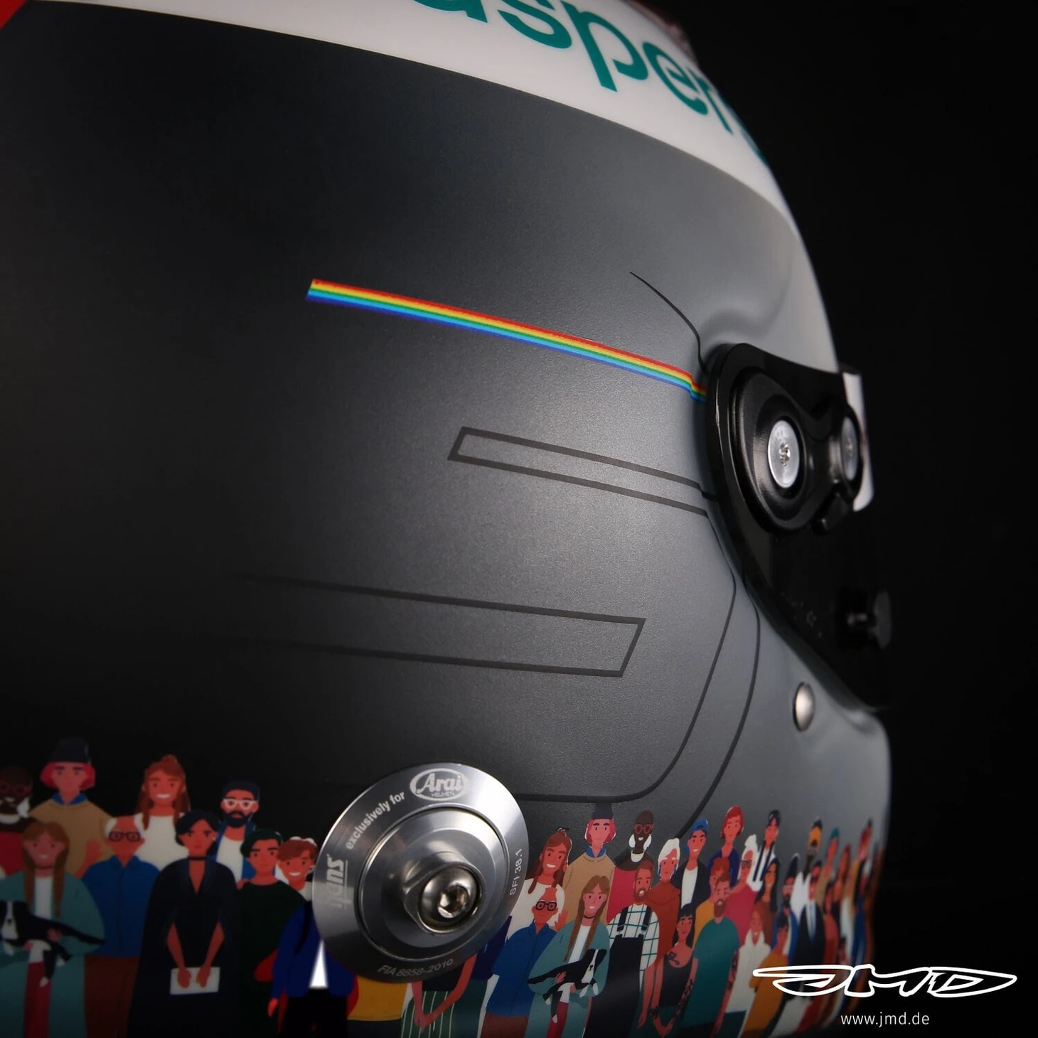 Радуга стала основным элементом дизайна шлема: Себ заменил ею ставший классическим немецкий флаг, идущий от подбородка к затылку, сохранив узнаваемую структуру ливреи, а также оживил свой номер – пятерку.