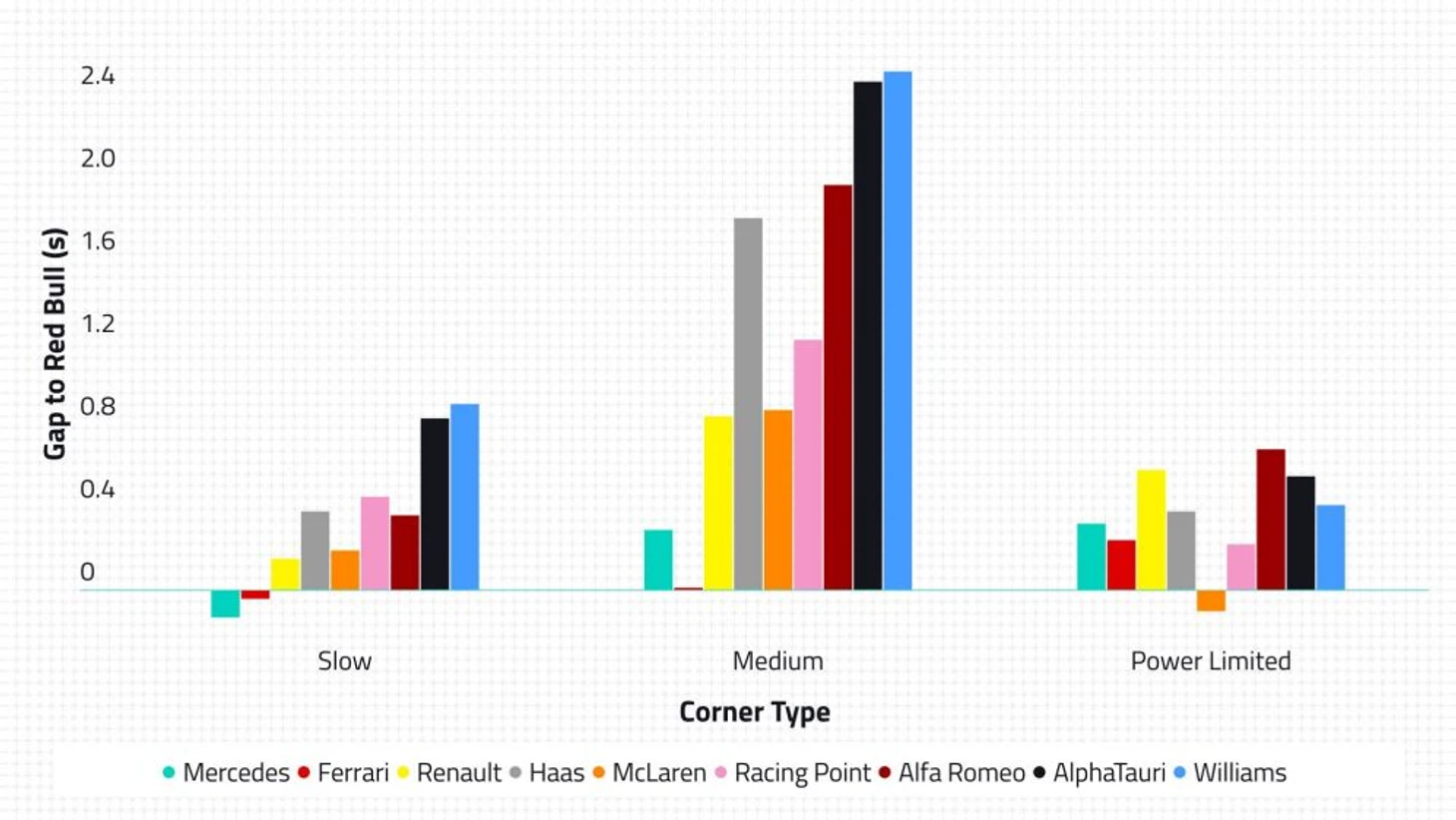 Бирюзовый столбик – «Мерседес», красный столбик – «Феррари», розовый – «Рейсинг Пойнт», желтый – «Рено», оранжевый – «Макларен», бордовый – «Альфа Ромео», голубой – «Уильямс» серый – «Хаас» черный – «Альфа Таури», отрывы сформированы по отношению к «Ред Булл».