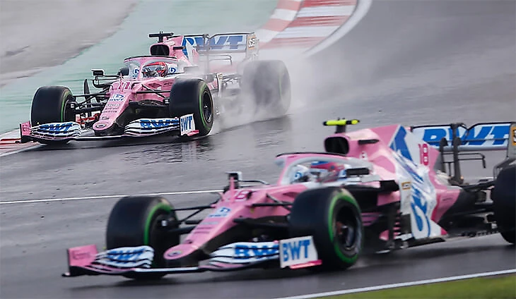 «Рейсинг Пойнт» удивил всех уже в субботу: на самом скользком треке сезона, да еще и под дождем именно пилоты в розовом показали себя лучше всех: Ланс Стролл взял поул, а его напарник забрал третью стартовую позицию.