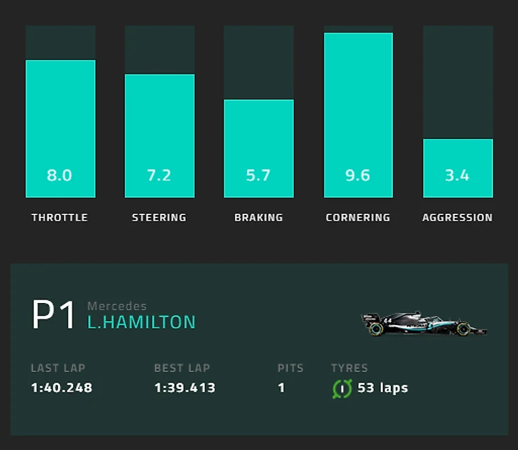 Третье место занял Льюис Хэмилтон из «Мерседеса» – с оценкой в 6,8. Она сложилась из 8 за работу с педалью газа, 7,2 за работу рулем, 5,7 за работу на торможениях, 9,6 за прохождение поворотов и 3,4 за «агрессивность». Семикратный чемпион стартовал шестым и выиграл гонку.