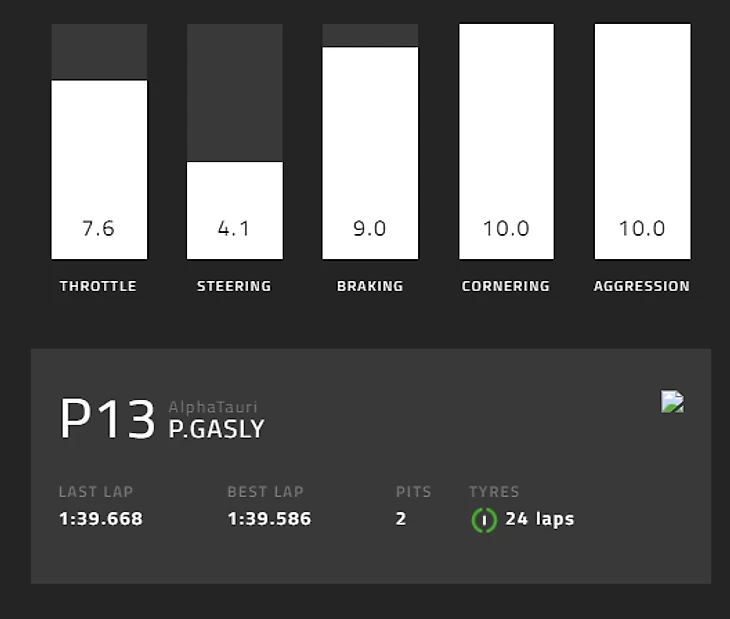 В соответствии с рейтингом лучше всех пилотировал Пьер Гасли из «Альфа Таури». Его оценка в 8,2 сложилась из 7,6 за работу с педалью газа, 4,1 за работу рулем и 9 за работу на торможениях, 10 за прохождение поворотов и 10 за «агрессивность». Пьер стартовал 18-м и финишировал 13-м.