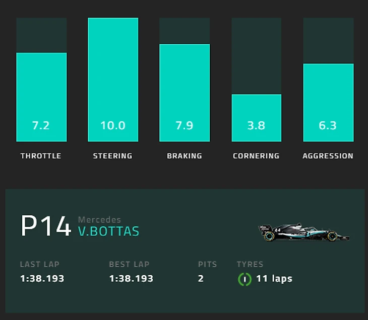 Второе место занял Валттери Боттас из «Мерседеса» – с оценкой в 7. Она сложилась из 7,2 за работу с педалью газа, 10 за работу рулем, 7,9 за работу на торможениях, 3,8 за прохождение поворотов и 6,3 за «агрессивность». Финн стартовал 9-м и финишировал 14-м.