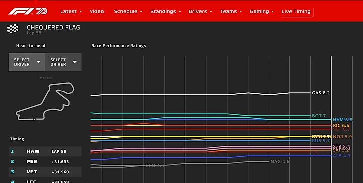 После каждой гонки на официальном сайте «Формулы-1» в разделе лайвтайминга на странице «выступлений» публикуются оценки пилотам за Гран-при по данным телеметрии. Вот – рейтинг после Гран-при Турции.