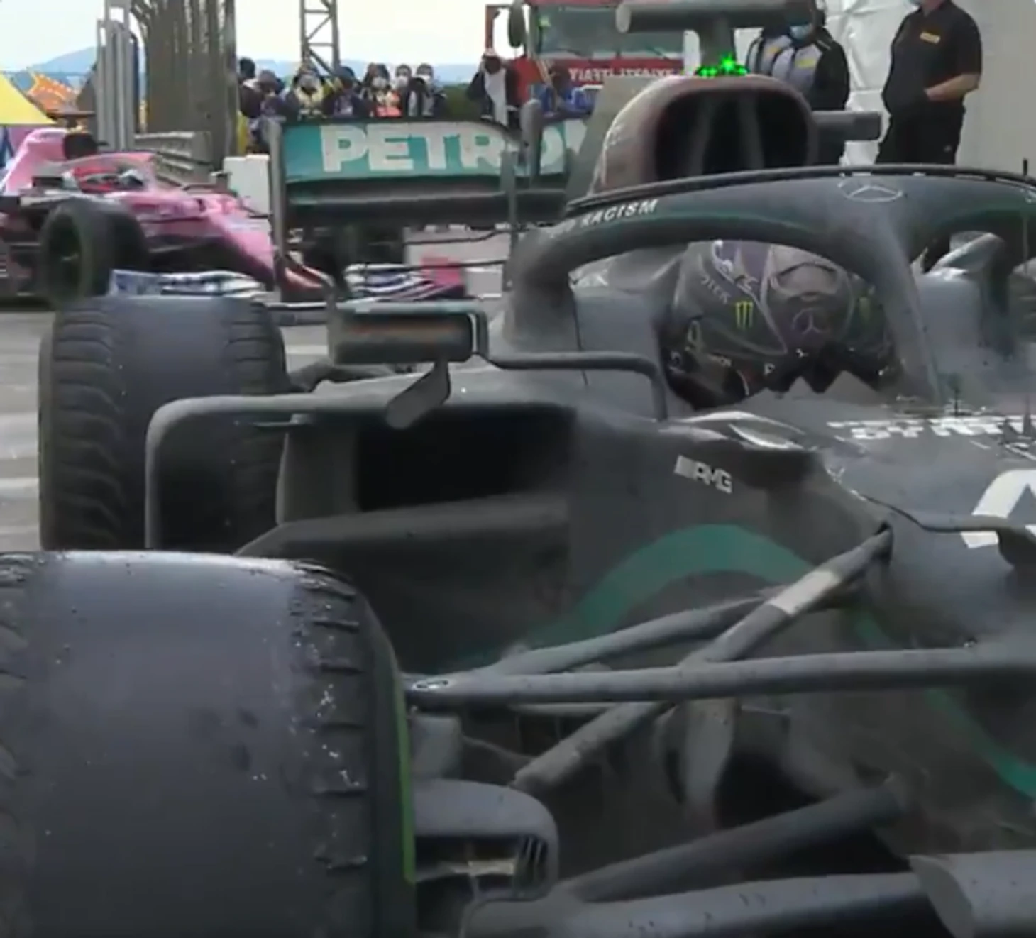 Да, именно благодаря чрезмерной нагрузке на покрышки Льюис Хэмилтон выиграл Гран-при, а Серхио Перес приехал вторым (когда его напарник поехал на пит-стоп – то тут же с первого места свалился за пределы топ-6 и едва набрал очки).