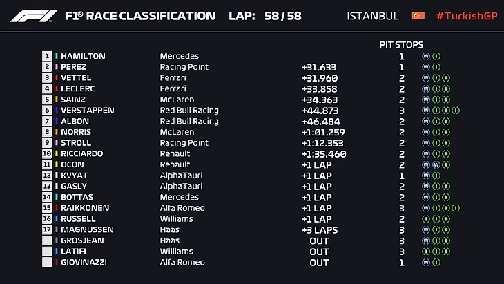 Хэмилтон в итоге создал такой задел, что спокойно мог провести пит-стоп (но за него это сделал Боттас), а Перес на последнем секторе последнего круга чуть было не опустился со второй строчки на пятую: Леклер (да-да, неудачная первая половина гонки была компенсирована потрясающей второй) на обратной прямой прошёл мексиканца, но ошибся на торможении, пропустил Феттеля и мог пропустить Сайнса, но остался все-таки четвёртым. В результате эти четверо уместились в три секунды на финише!