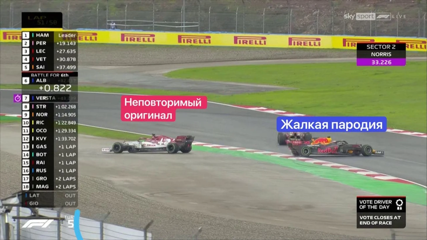 Большинство аэродинамических решений и мощности двигателей были нивелированы. Вот есть мокрый асфальт, резина и гонщик. Мы смогли понять кто действительно профессионал. Произошел социализм. Всех уровняли.