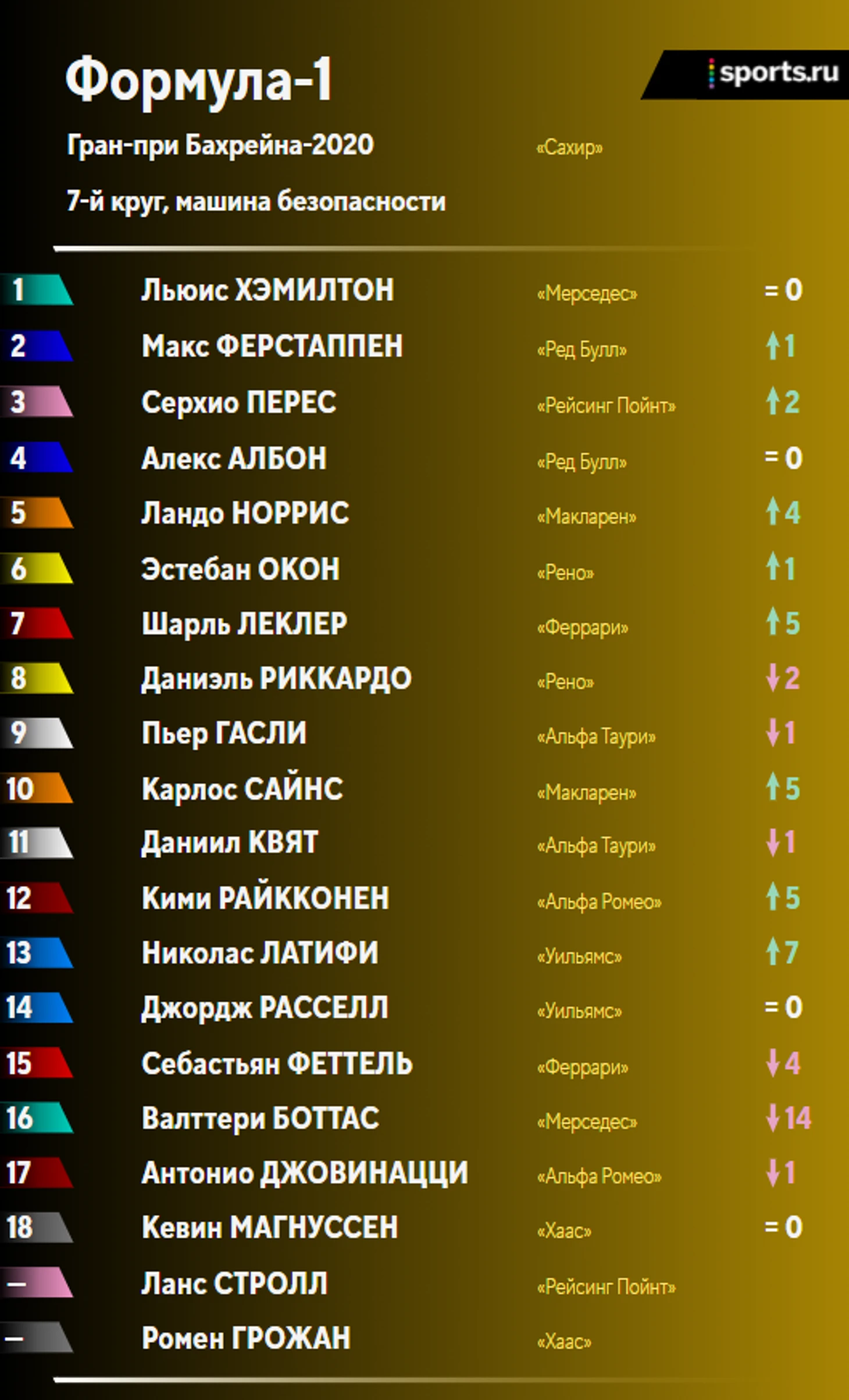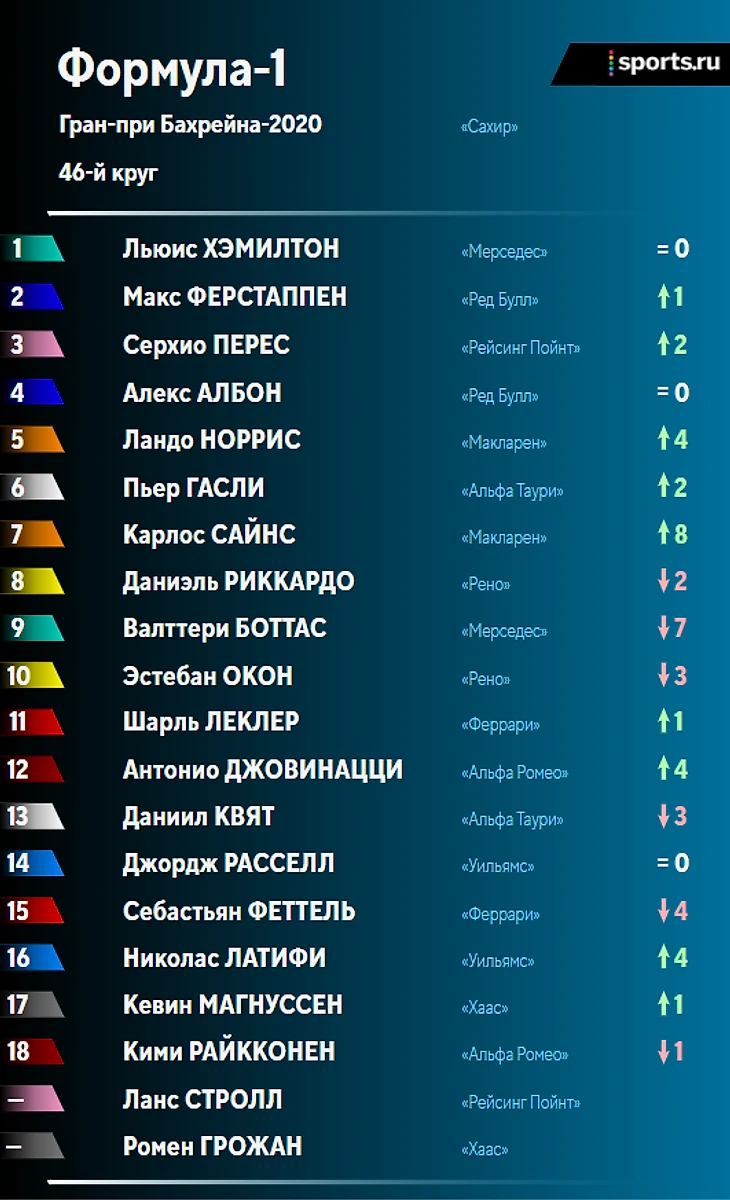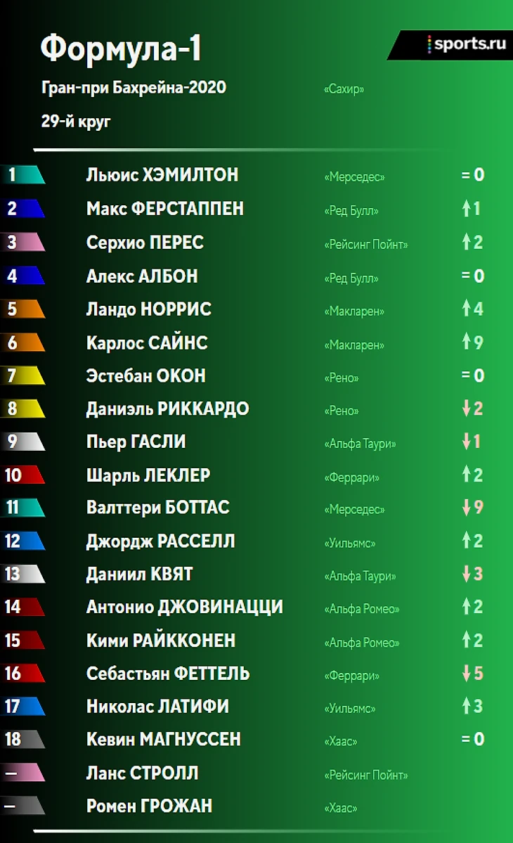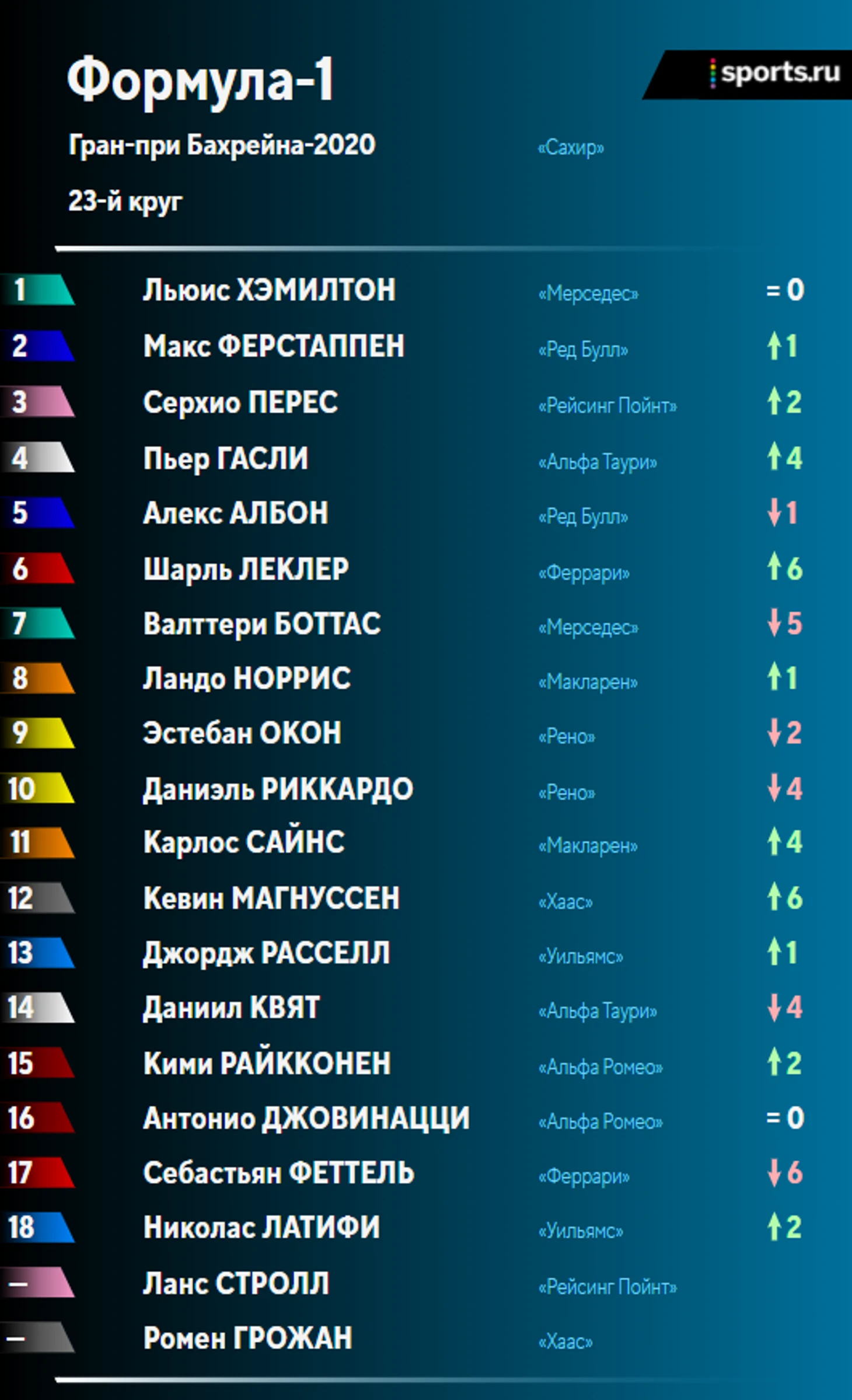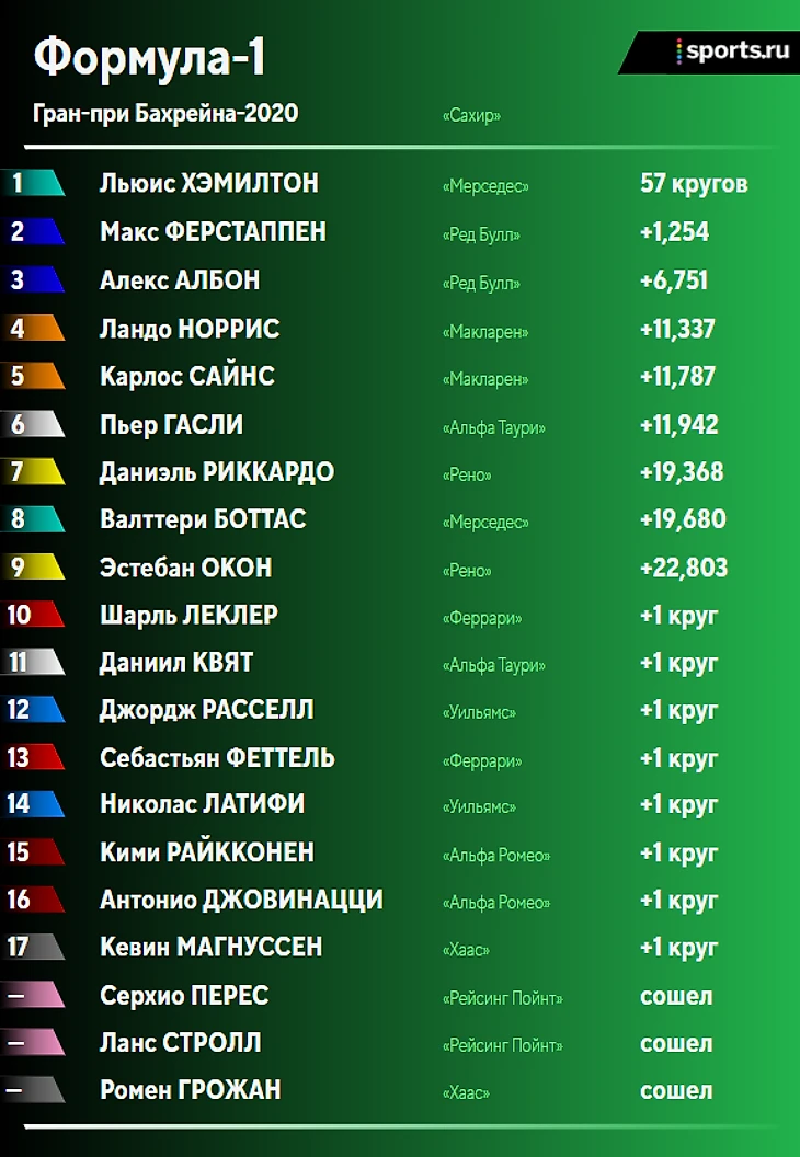 20:19 Все на этом! Чуть ниже – таблички. До встречи в следующие выходные – будет еще одна гонка в Бахрейне, но на необычной по своей конфигурации трассе!