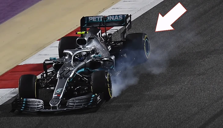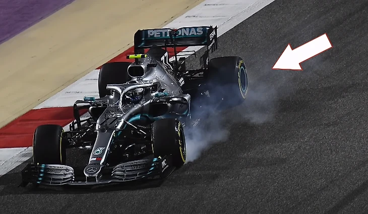 Но все равно заблокировал колесо – потому что Валттери приближался к точке замедления с намного более крутого угла.