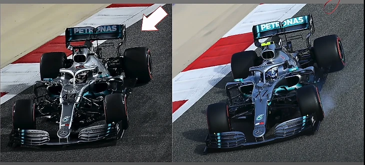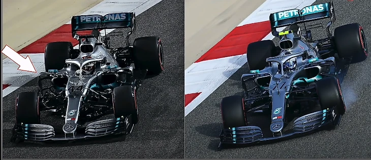 Здесь видны отличия в положении болида относительно поребриков. Посмотрите, где находится корпус машины Льюса, а где расположился болид Валттери.