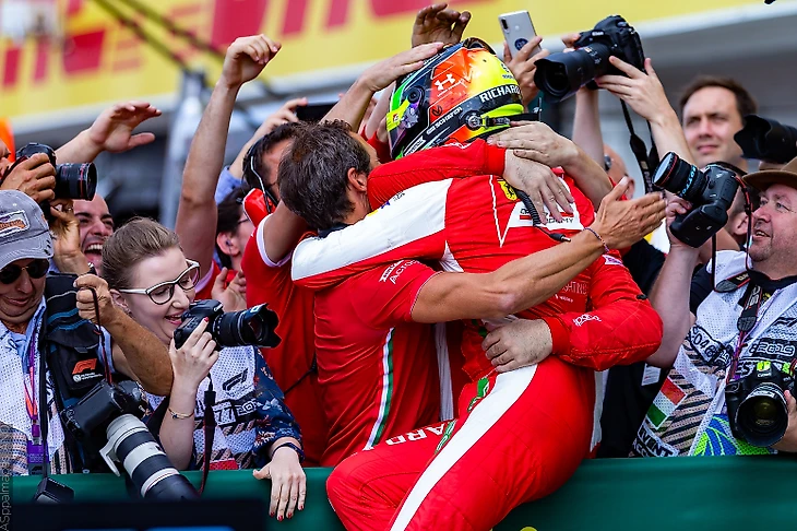 Мик Шумахер в объятиях своей команды празднует первую победу. Фото: © ASppaImages ANO Photoagency / Aleksandr Seregin © Фотоагентство АСППА ИМАДЖЕС АНО F1 & Motorsport Photography