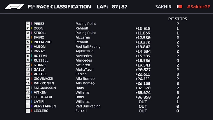 В Mercedes вспомнили прошлогодний Хоккенхайм и вернули своих пилотов на трассу четвёртым (Боттас) и пятым (Расселл). Пелетон к тому момент возглавлял... Перес. Расселл быстро расправился с Боттасом, Строллом и Оконом и начал приближаться к Чеко, пока вновь не отправился в боксы. На этот раз - медленный прокол. До конца гонки британец смог вернуться в очки и закончил заезд позади Боттаса, финишировавшего только восьмым (!).