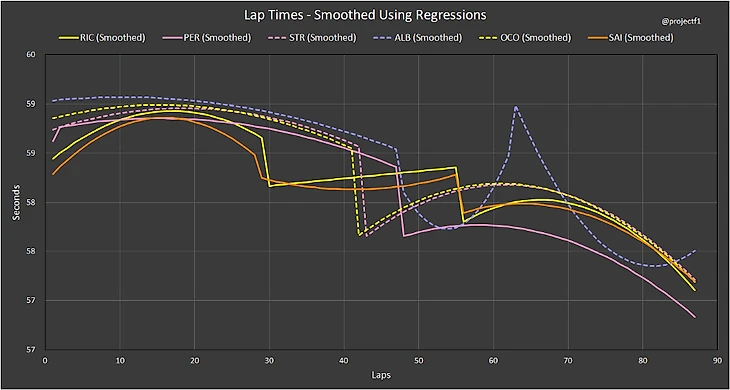 Это расчет кругов пилотов, претендовавших на подиум на Гран-при Сахира – в соотвествии с поправкой на износ шин и расход топлива (с использованием регрессии, круги за ск заменены медианными временами – спасибо блогу ProjectF1). Обратите особое внимание на первый отрезок: Перес гнал быстрее всех конкурентов на схожей тактике одной остановки в боксах – и Стролла, и Окона, и Албона – примерно на 0,25 секунды с круга (или на 0,5 секунды с более обычного по размерам круга «Ф-1» по сравнению с очень коротким на этом Гран-при).