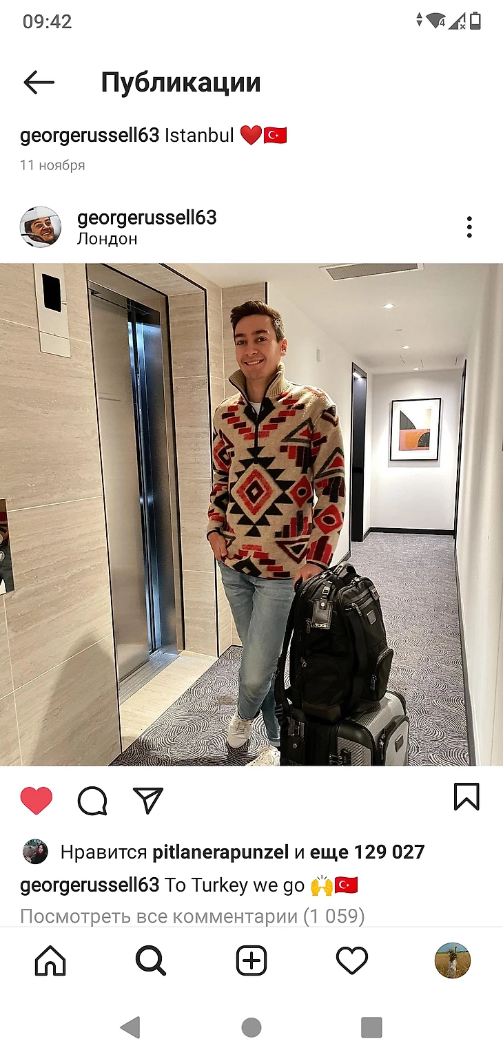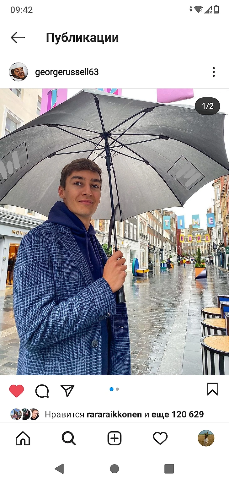 Еще один товарищ в компании Кевина и Антонио - Николас Латифи. Впрочем, посты появляются после каждого Гран-При и в основном выдержаны в гоночном стиле. А вот у недавнего триумфатора Джорджа Расселла "интернетная" жизнь весьма интересная. Молодой британец является активным пользователем социальных сетей. И не сказать, чтобы как-то много "инсайдов" или чего-то необычного. Вроде бы тот же гоночный стиль: фотографии с тренировок, из паддока. Но все публикации излучают счастье, какие-то теплые. А бывают и вовсе душевные фото: то в домашнем свитере появится, то в дождливый день под зонтом.