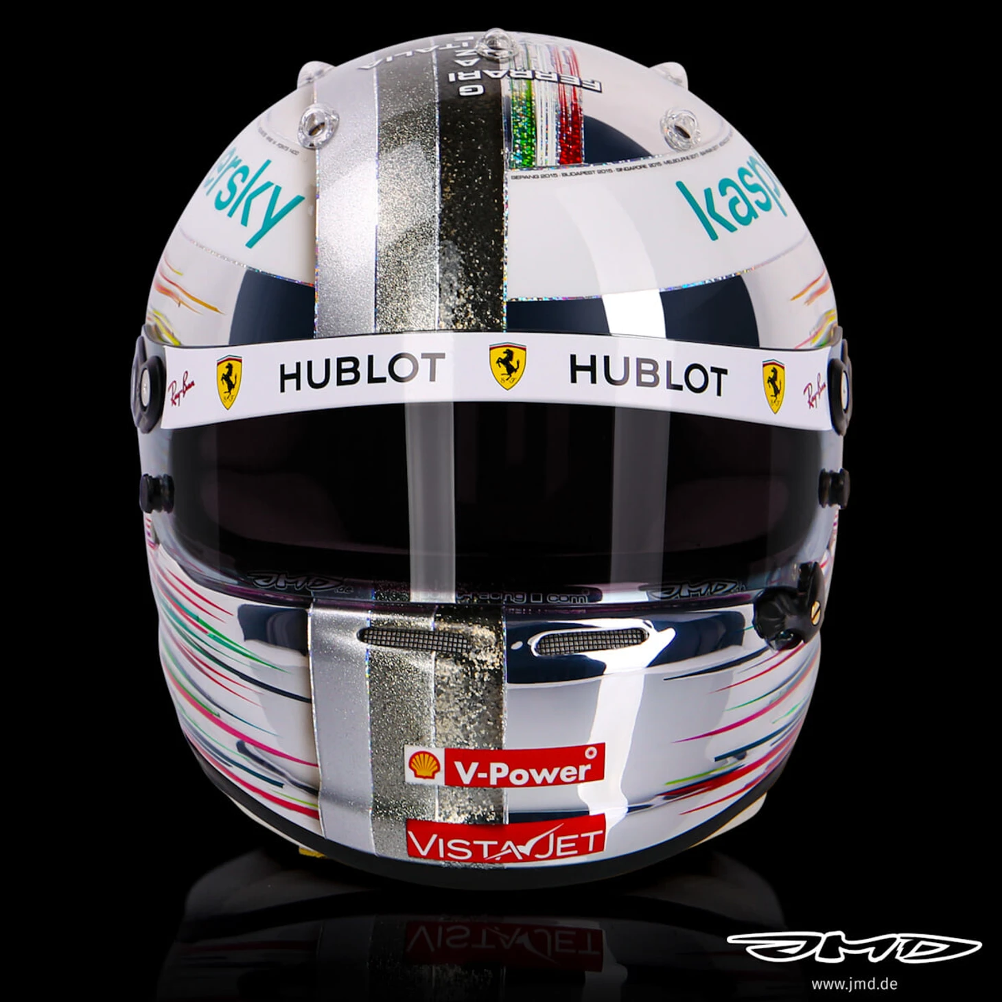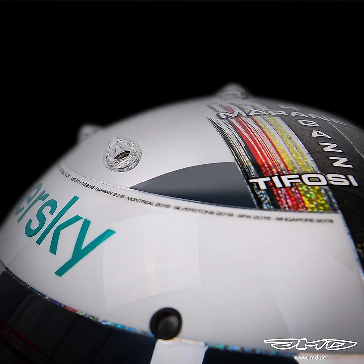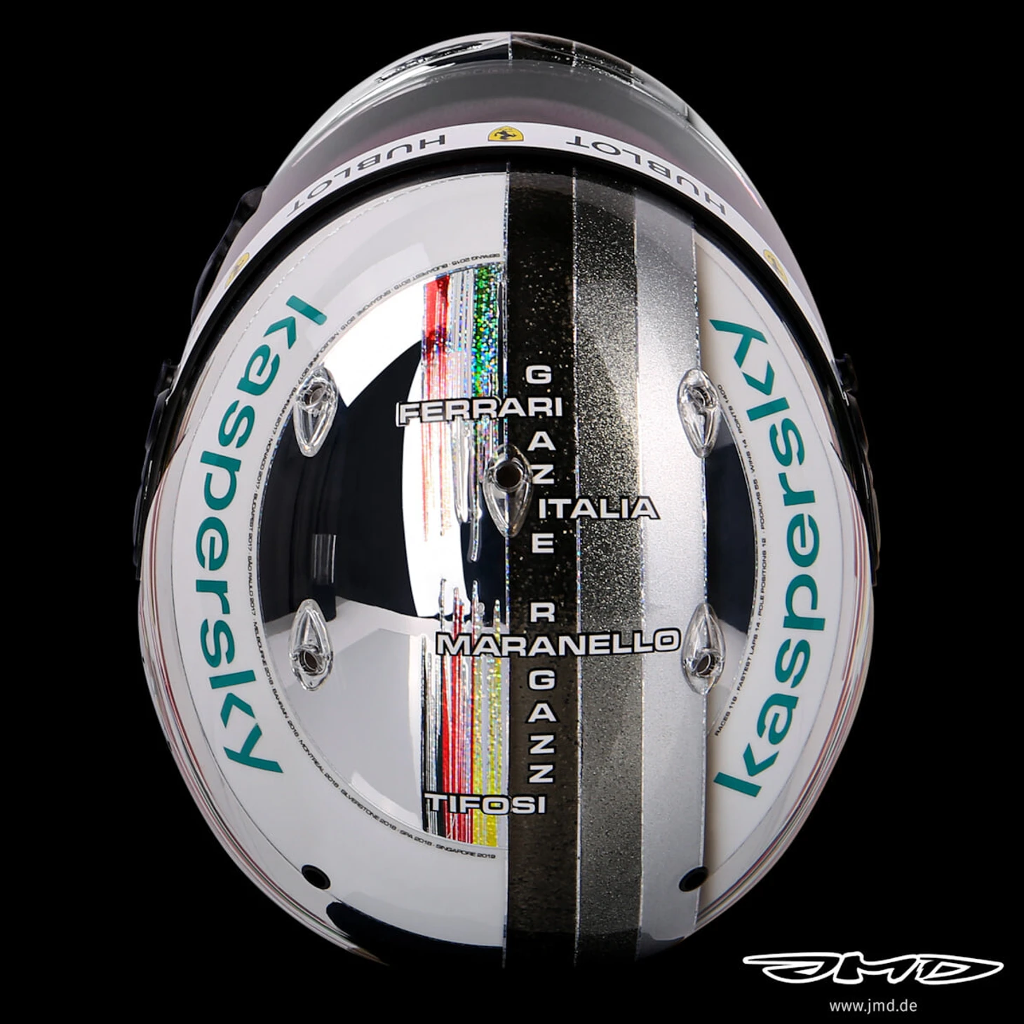 Себ сохранил привычную структуру своей ливреи с полосами на верхней части и огромными жеребцом «Феррари» и пятеркой на краях. Для ночных гонок Феттель выбирает блестящие шлемы – под огнями прожекторов хром будет смотреться здорово.