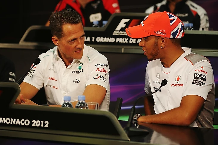 Имена выше заслуживают большого внимания, но для меня, человека, который полюбил Ф1 в самом начале нового тысячелетия, мир Королевы автоспорта долгое время оставался биполярным: Михаэль Шумахер и все остальные. Наберусь храбрости заявить, что многие фанаты Формулы, пристрастившиеся к ней в 90-ые и начале 2000-х, со мной солидарны. Далее короткая иллюстрация величия Михаэля. Безусловно, в первую очередь, все гонщики борются за победу на Гран-при. Кроме того, есть еще 2 важных показателя в рамках уик-энда, которые вкупе с победой в гонке составляют так называемый "Большой шлем": поул-позиция (победа в квалификации) и лучший круг. Михаэль Шумахер закончил карьеру 25 ноября 2012. На 25 ноября 2012 рекорды по количеству побед, количеству поул-позиций и количеству поставленных лучших кругов за всю историю Формулы-1 принадлежали... Михаэлю Шумахеру. И венец легендарности Красного барона - семь уже упомянутых выше чемпионских титулов. К концу 2012 завершились 63 чемпионата Ф1. Семь из них выиграл один человек. Достижение, которое казалось недостижимым... Где-то в мире сейчас смеется один Льюис Хэмилтон, оформивший седьмой титул на Гран-при Турции месяц назад. (На фото Михаэль и Льюис face-to-face.) Надо сказать, завоевал Льюис его, что называется, "в одну калитку". Тотальная доминация "Мерседеса" и самого Хэмилтона сделали свое дело. Из 17 гонок британец выиграл 11, не оставив никому шансов. Наверное, это стоит отдельного поста в блоге, но Льюиса и без того много, поэтому немного поговорим о другом и о других.