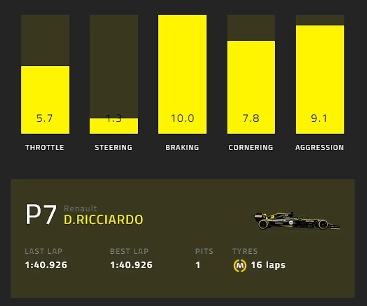 Второе место занял Даниэль Риккардо из «Рено»(в Сахире он был лучшим) – с оценкой в 6,8. Она сложилась из 5,7 за работу с педалью газа, 1,3 за работу рулем, 10 за работу на торможениях, 7,8 за прохождение поворотов и 9,1 за «агрессивность». Дэн финишировал 7-м после старта на 11-м.