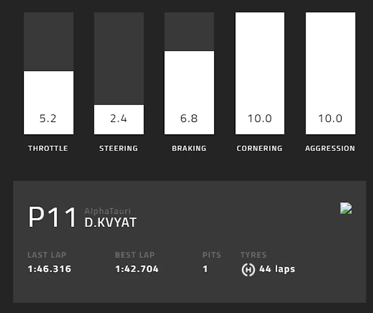 В соответствии с рейтингом лучше всех пилотировал россиянин Даниил Квят из «Альфа Таури». Его оценка в 6,9 сложилась из 5,2 за работу с педалью газа, 2,4 за работу рулем и 6,8 за работу на торможениях, 10 за прохождение поворотов и 10 за «агрессивность». №26 стартовал 7-м и финишировал 11-м.