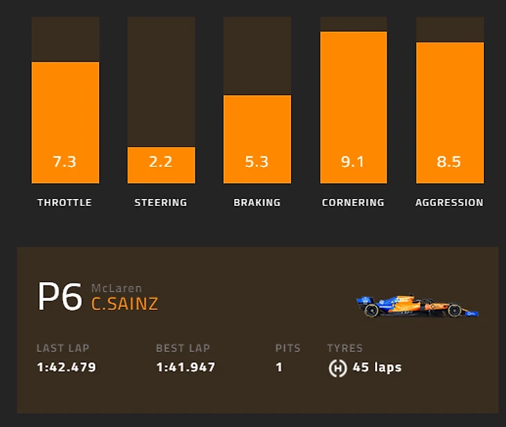 Третье место занял Карлос Сайнс из «Макларена» – с оценкой в 6,5. Она сложилась из 7,3 за работу с педалью газа, 2,2 за работу рулем, 5,3 за работу на торможениях, 9,1 за прохождение поворотов и 8,5 за «агрессивность». Карлос стартовал и финишировал 6-м.