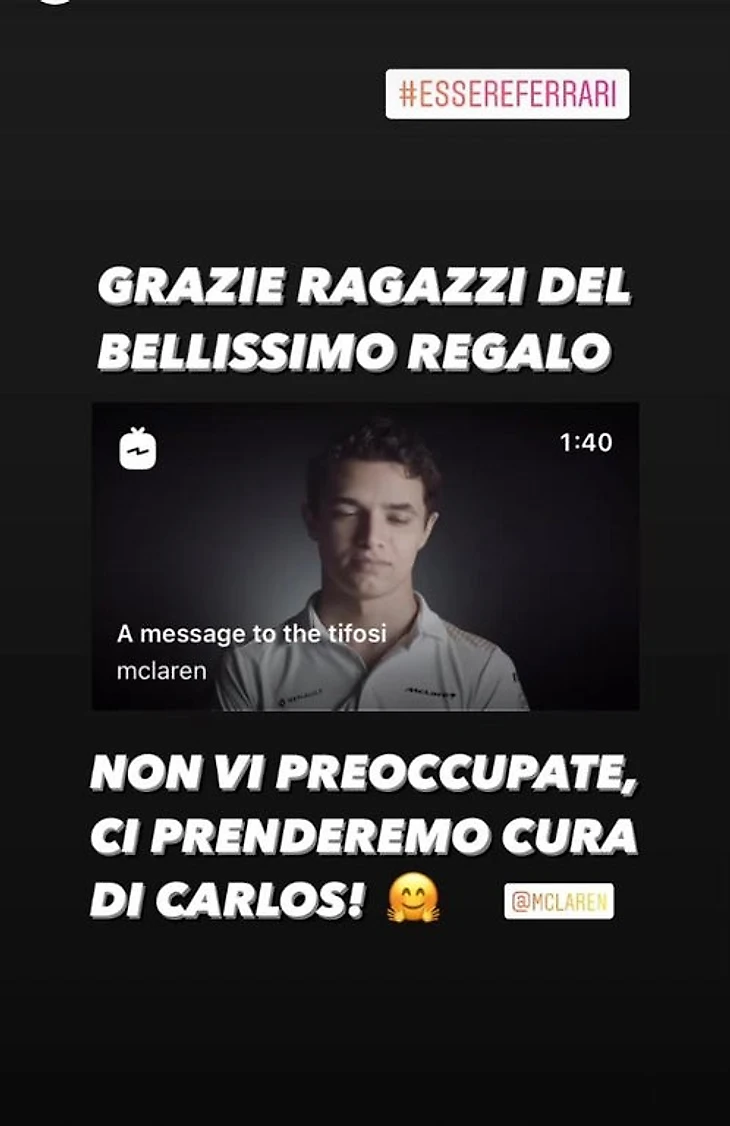 «Макларен» и «Феррари» похожи на два противоположных полюса, которые притягиваются друг к другу. Вы одновременно и противники, и друзья. И мы уважаем и Скудерию, и тифози. Поэтому в это особое время года, доброе для всех людей, мы посылаем вам подарок. Мы заботились о нем последние два года, присматривали и помогали ему расти. Теперь ваша очередь. Заботьтесь о нем так же, как заботились мы.