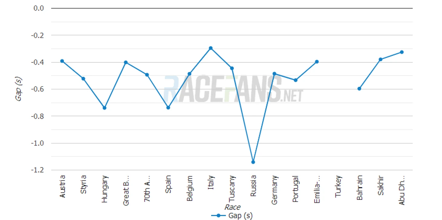 Более того, №23 так и не смог показать способность регулярно набирать большие очки и демонстрировать устойчивый прогресс. Только посмотрите на динамику его отставаний от Ферстаппена в квалификациях.