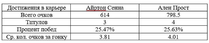 «Существуют три вида лжи: ложь, наглая ложь и статистика». Статистику выступлений Сенны и Проста можно трактовать по-разному, кому как больше понравится. Например, фанаты Сенны указывают на его 3 титула чемпиона мира, 65 поул-позиций, 80 подиумов и 41 победу из 161 старта, чтобы продемонстрировать его величие и превосходство. Поклонники Проста говорят о его 4 титулах, 51-й победе, 106 подиумах и общей сумме очков за карьеру в 798,5 очков из 199 стартов.