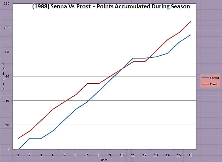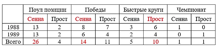 Чтобы сделать анализ как можно более справедливым, я использовал двухлетний период, когда они оба выступали за «Макларен» (88-89), так как это, пожалуй, лучшая и единственная возможность реально оценить их относительные выступления: