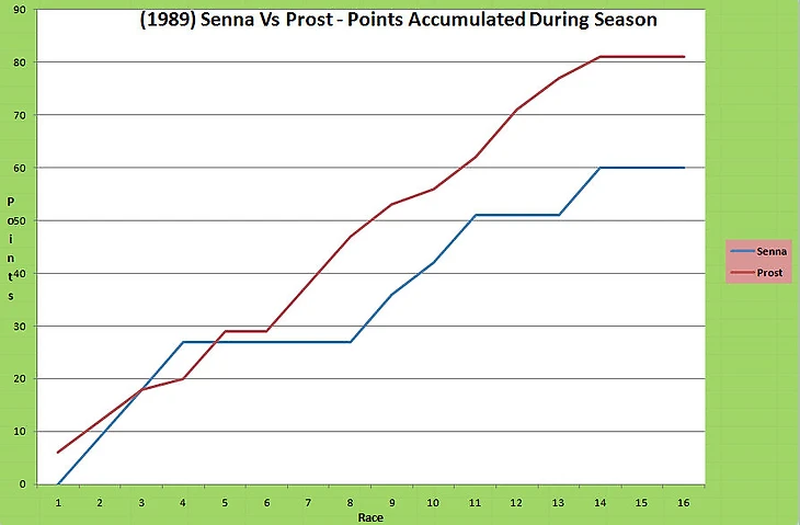 Прост обошел Сенну по очкам в обоих сезонах. Айртон Сенна выиграл чемпионат в 1988 году, так как тогда правила гласили, что только 11 лучших результатов засчитываются в чемпионате. Это был первый и единственный год, когда победитель чемпионата не набрал наибольшее количество очков (с учетом всех 16 финишей). От этого правила избавились в 91-м.