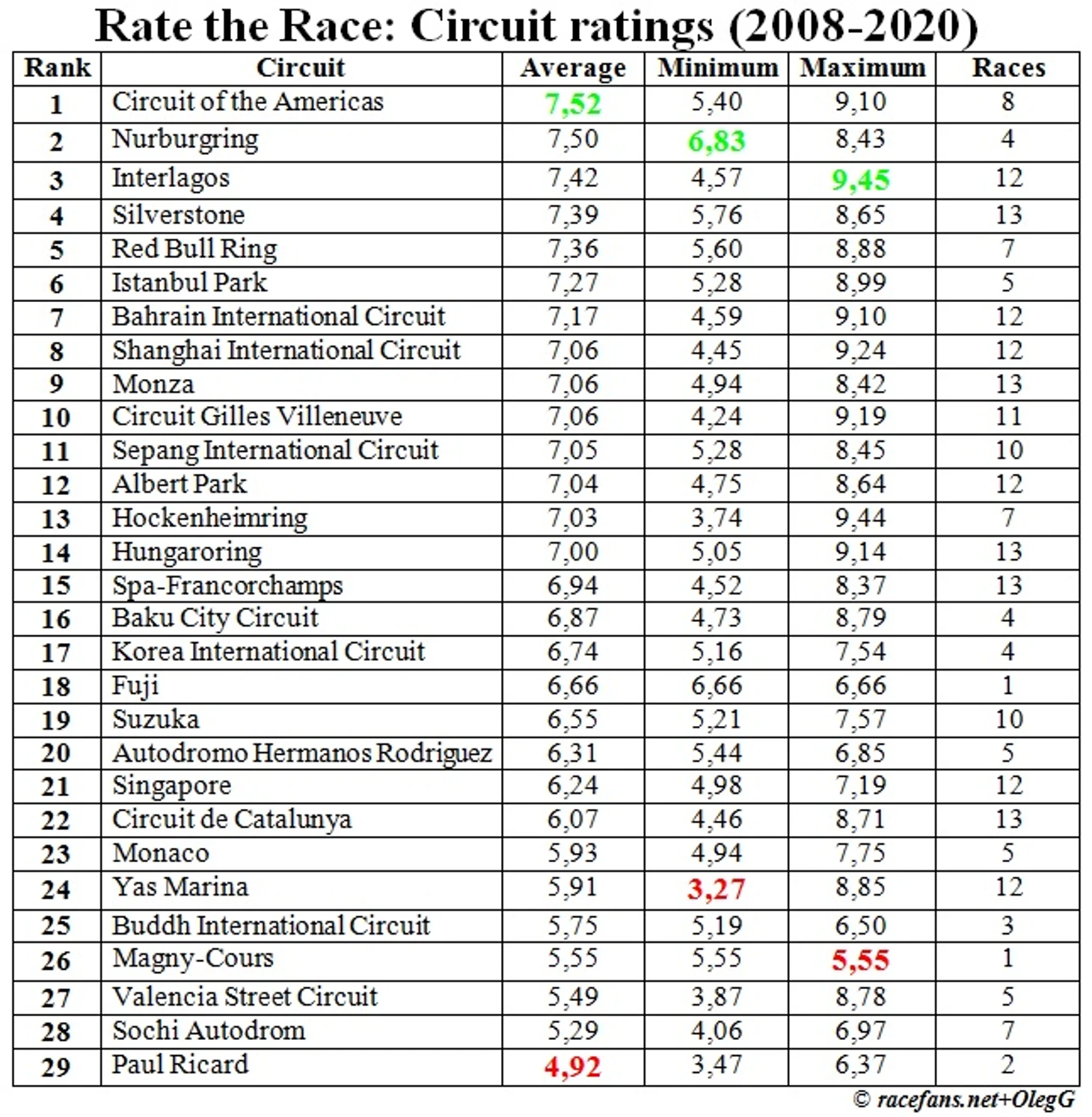 И еще один рейтинг по оценкам гонок на сайте racefans.NET: рейтинг трасс на основе оценок гонок с 2008 по 2020 годы.