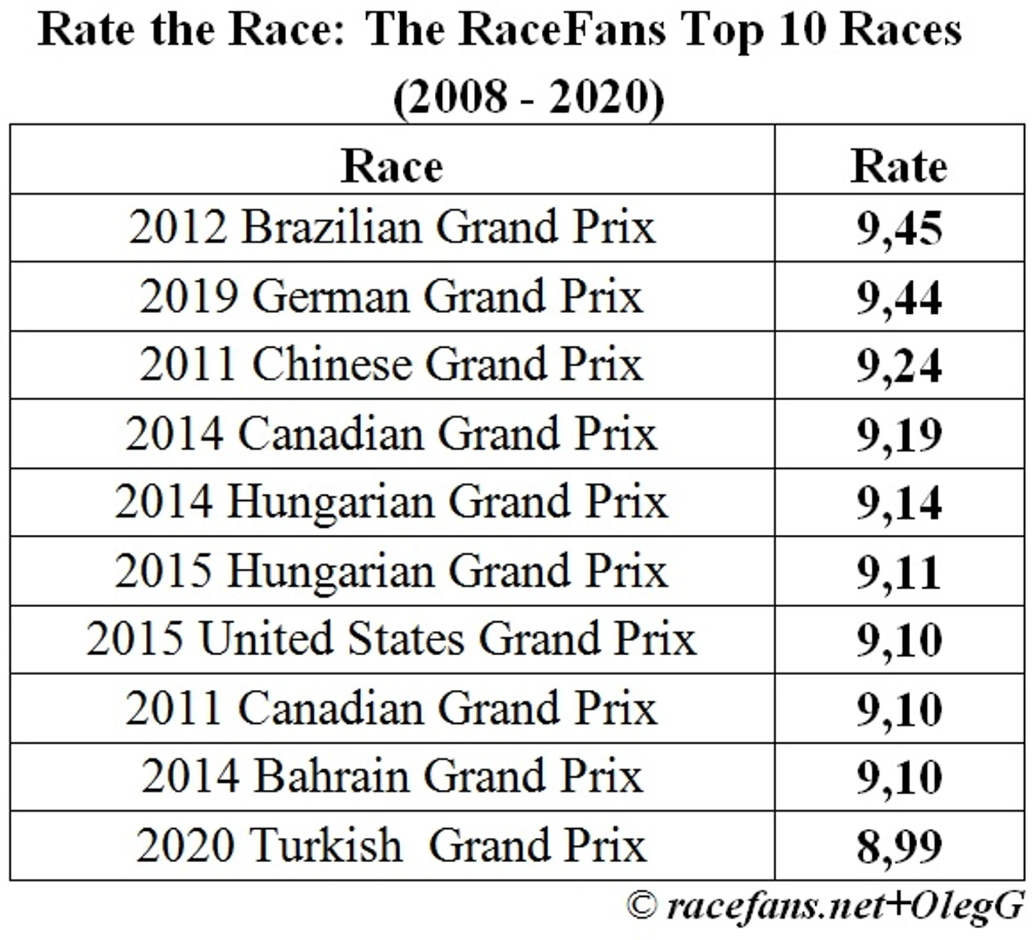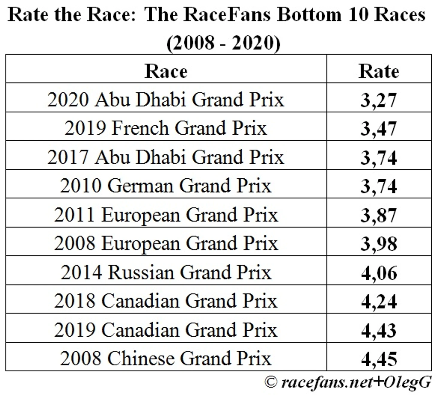 На сайте racefans.net рейтинги составляются на регулярной основе с 2008 года. Это дает возможность составить ТОП 10 для лучших и худших гонок за 12 лет. Причем этот сезон отметился как в одном так и в другом ранжире.