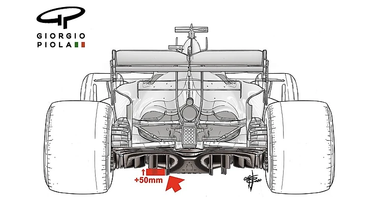 С этого года в этой области не должно быть никаких прорезей. Эта часть днища станет похожа на треугольник с целью уменьшения площади днища, что уменьшит прижимную силу, генерируемую в задней части машины.