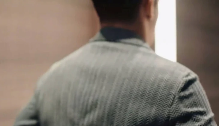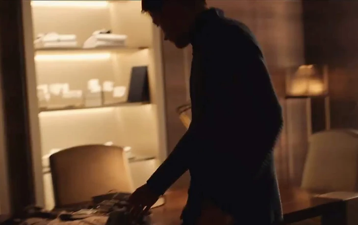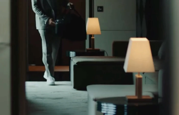 Мы видим, как Леклер заходит в номер. Он в классическом костюме светло-серого цвета, светло-голубой рубашке и белых кедах, скидывает пиджак.