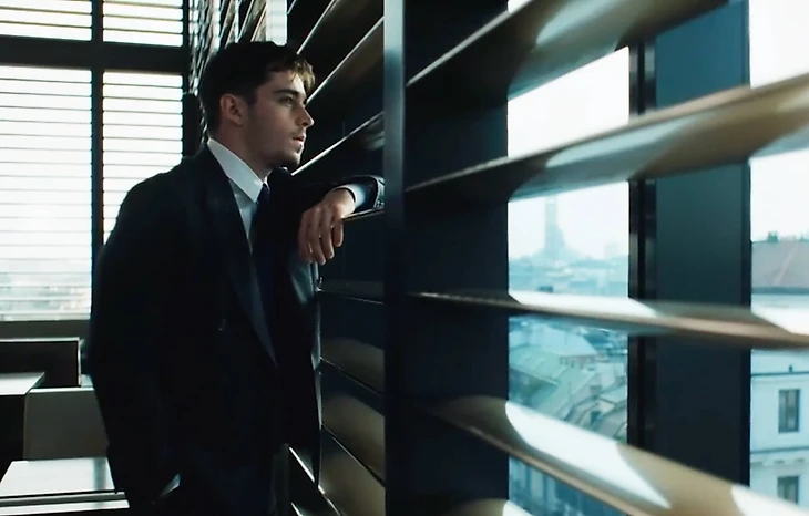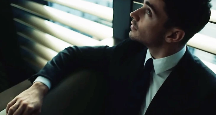«Если бы меня попросили стать шоуменом и больше играть на публику – я бы не стал меняться. Я тот, кто я есть и не хочу быть кем-нибудь другим». Шарль в темном костюме из мягкой ткани с рисунком из дубовых листьев и перламутровыми пуговицами, перед ним эффектно закрываются двери с лого «Армани».