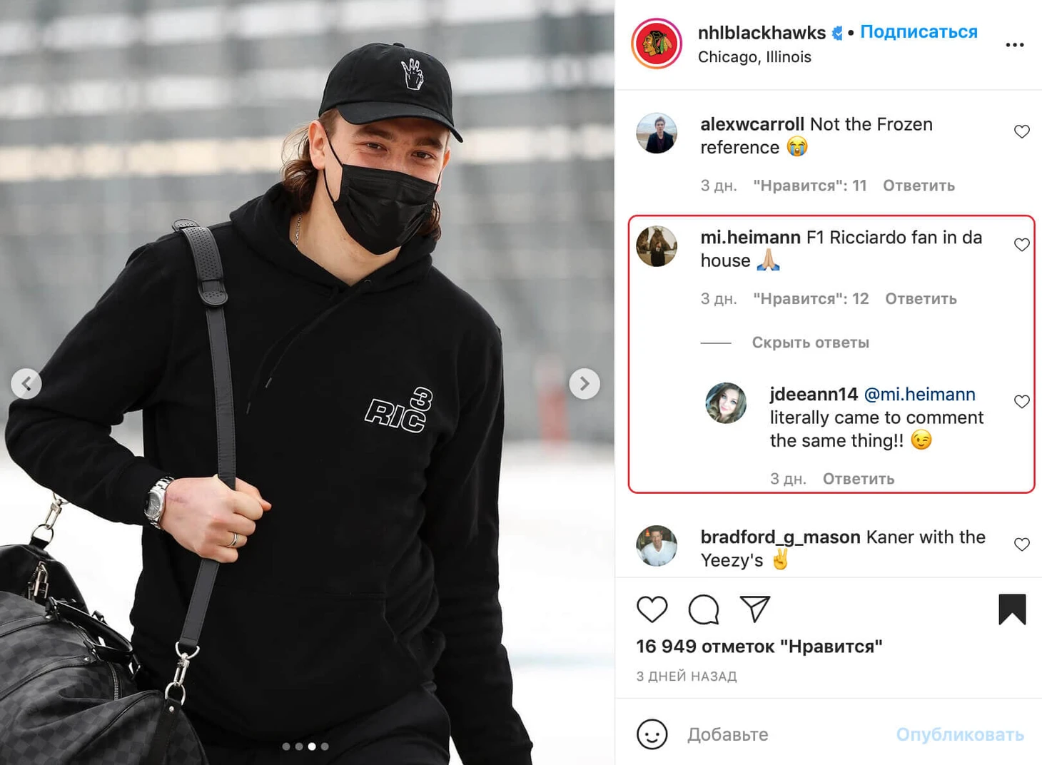 Российского хоккеиста Никиту Задорова, выступающего в НХЛ за «Чикаго Блэкхокс», заметили в брендированной одежде от пилота «Формулы-1» Даниэля Риккардо: черной толстовке и кепке с фирменными обозначениями.