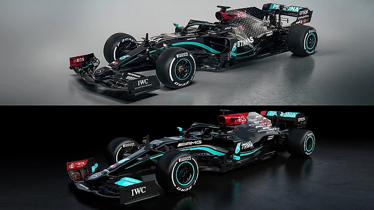 За W11 следует W12, который «Мерседес» перекрашивает в черный цвет передней части - чтобы позиционировать себя для открытого общества и против расизма. Однако в задней части автомобиля снова проявляется традиционное серебро. На кожухе двигателя нанесены логотипы AMG. Меньше звезд. Благодаря новому дизайну дочерняя компания Mercedes Performance будет более тесно связана с участием в «Формуле-1».