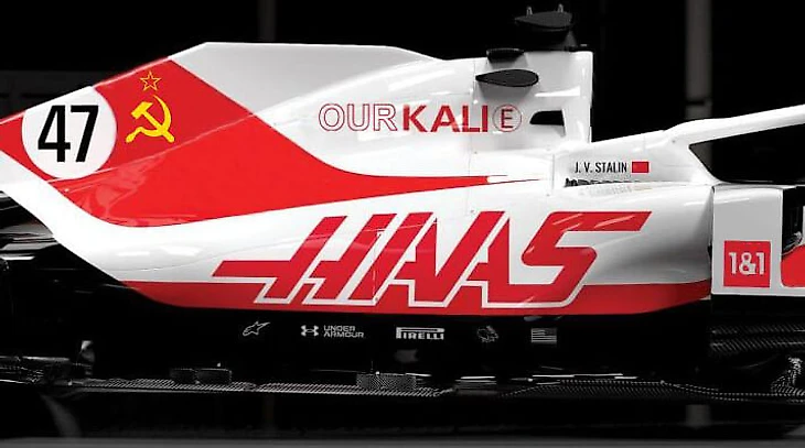 Дизайн «Хааса» в «Ф-1» сделали еще эпичнее: с советским флагом и Сталиным в качестве пилота. Это стеб над ливреей-триколором
