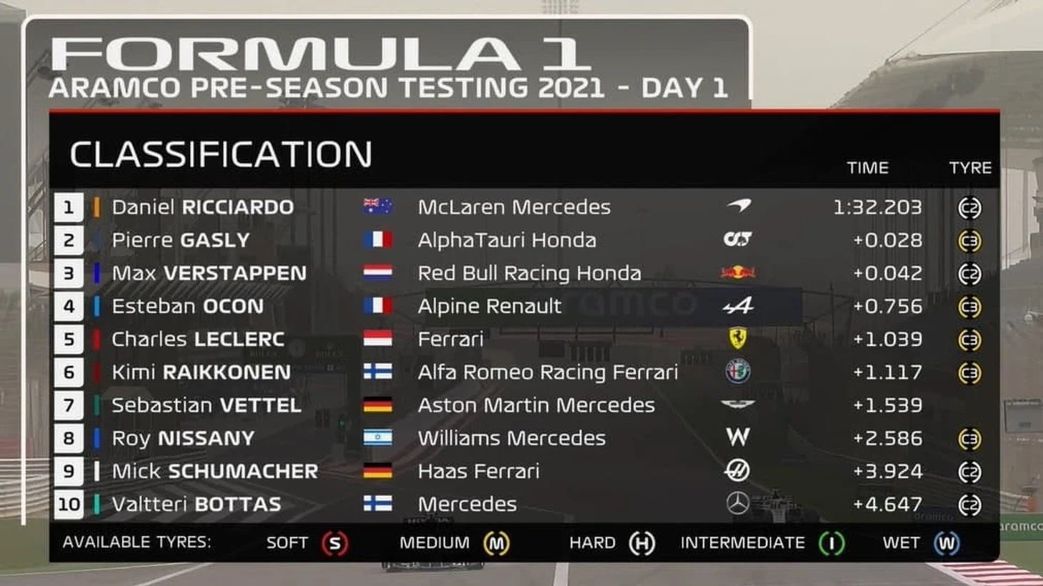 Из за малого количества кругов худшее время показал тот же Боттас. Лучшее же время осталось за Даниэлем Риккардо из Макларена.