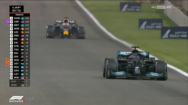 32-й круг. «Ред Булл» сообщил Ферстаппену, что тот может смело выезжать за пределы трассы в 4-м повороте, поскольку точно так делают Хэмилтон и Боттас и ФИА их не наказывает. Макс усомнился в легальности, но команда заверила, что суровые действия ФИА по удалению времен касались только практик и квалификации.