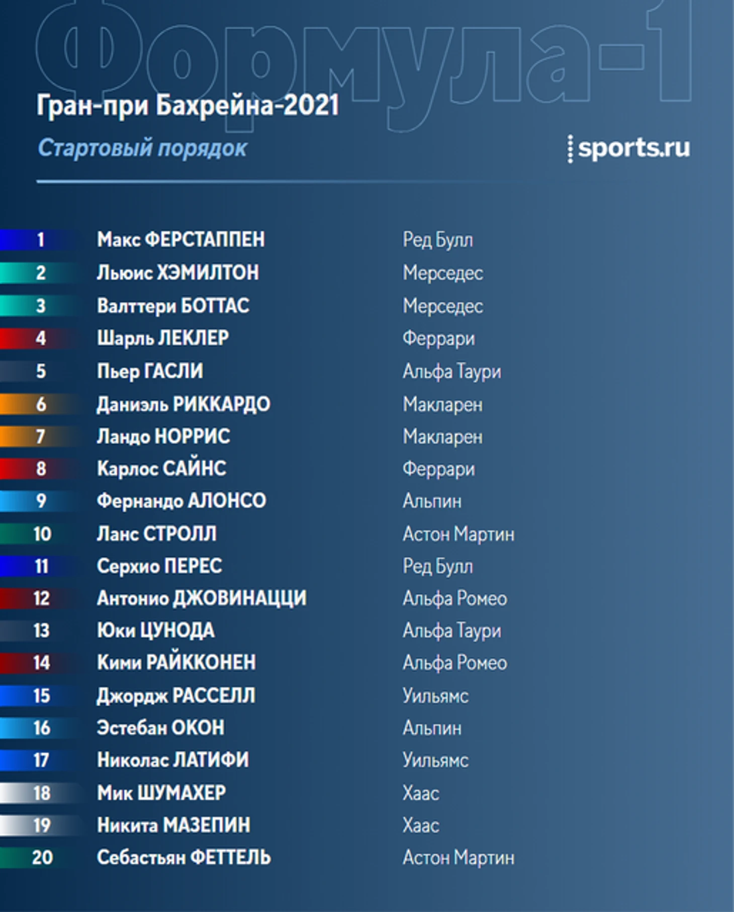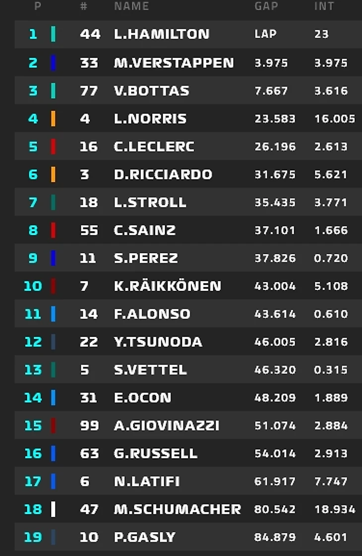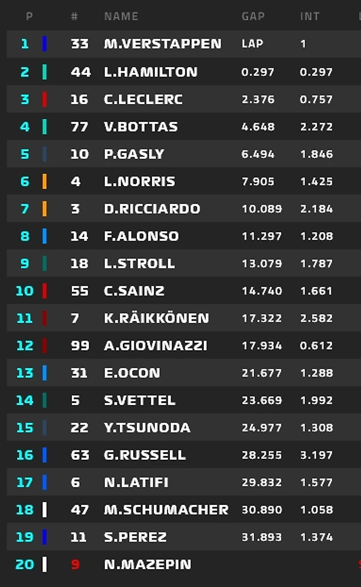 Ферстаппен-Хэмилтон / Боттас / Норрис-Леклер-Риккардо-Стролл-Сайнс / Джовинацци-Райкконен-Перес-Окон-Цунода-Феттель / Расселл-Латифи /Алонсо (посетил боксы) / Шумахер / Гасли.