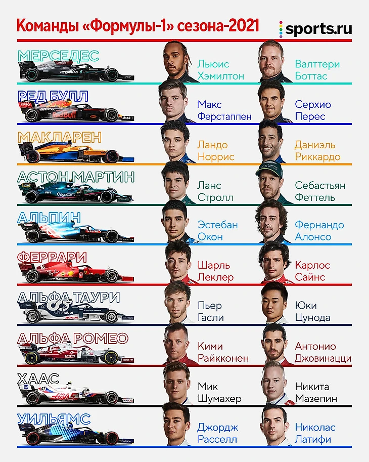 «Хаас» обновился полностью – на смену союзу Ромена Грожана и Кевина Магнуссена пришли Никита Мазепин и чемпион «Формулы-2» Мик Шумахер с «Уралкалием» Мазепина-старшего в качестве титульного спонсора. А вот «Альфа Ромео» с «Уильямсом» выбрали стабильность: Кими Райкконен по-прежнему выступает (осенью ему стукнет 42), Джордж Расселл пока не в «Мерседесе», Антонио Джовинацци и Николас Латифи еще в «Ф-1». Три аутсайдера разыграют последние места в Кубке конструкторов, причем на этот раз в худшей форме к сезону подходит команда русского пилота. Но в борьбе на дне таблицы все могут решить одно или два очка.