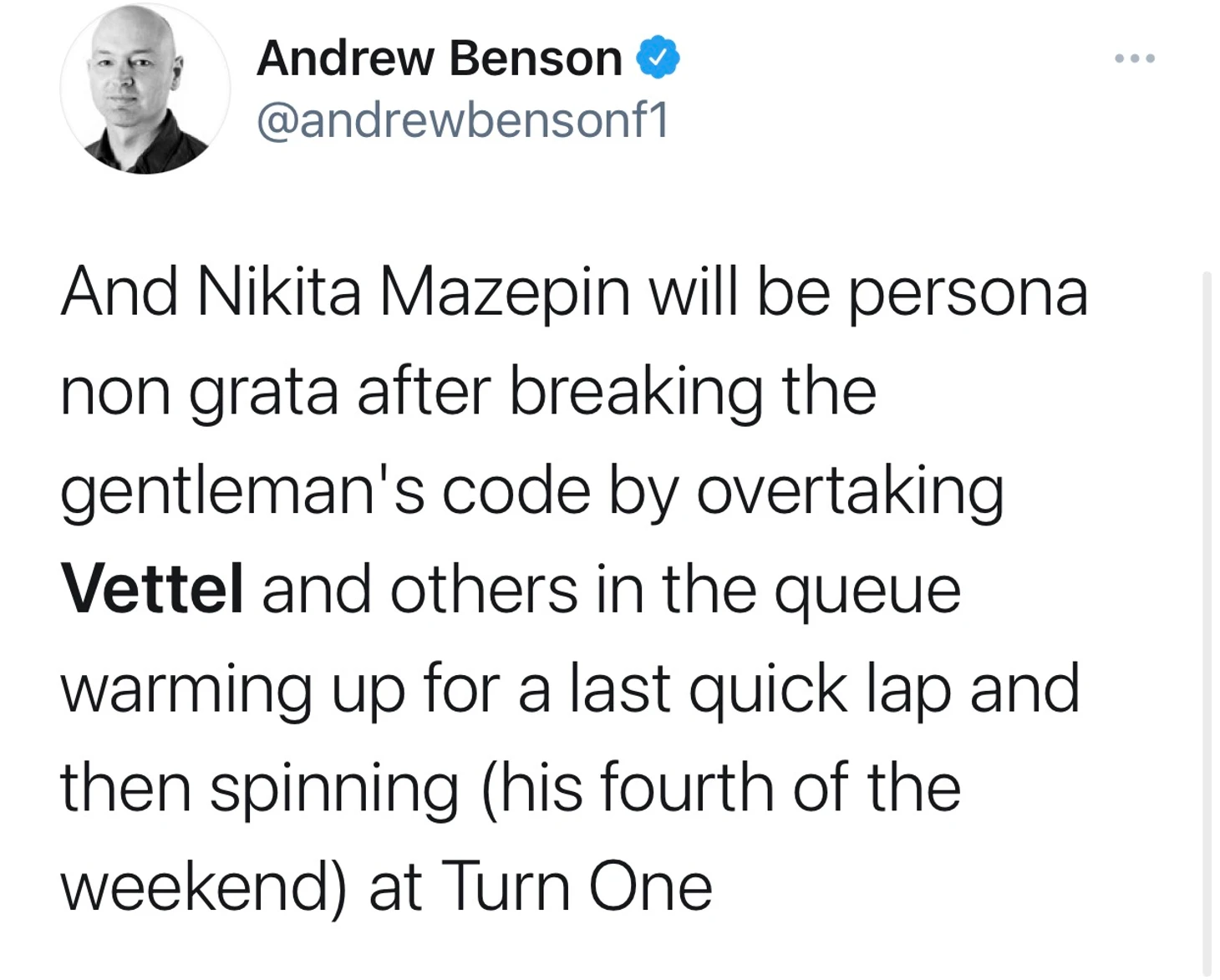 И Никиту явно возненавидят не только за разворот: прямо перед фэйлом в первом вираже Мазепин нарушил одно из главных неписанных правил гоночного кодекса – соблюдение очередности по выезду из пит-лейн на решающих попытках в квалификации. №9 опередил как раз Себа и еще нескольких гонщиков – Макс Ферстаппен в предыдущие сезоны, к примеру, орал за такое по радио и обещал месть.