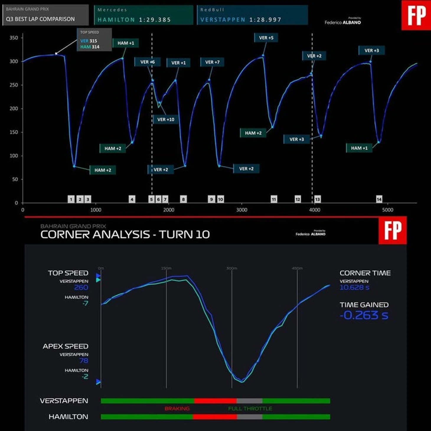 Причем изучение данных телеметрии Макса и Льюиса показывают: №44 проиграл не из-за отдельной ошибки. Хэмилтон уступил 7 точек торможений из 8 и вчистую слил сложнейшую связку 9 и 10 поворотов (0,263 секунды – больше половины всего отрыва в 0,388 секунды) – спасибо удобной графике-сравнению от Федерико Албано из Formula Passion.